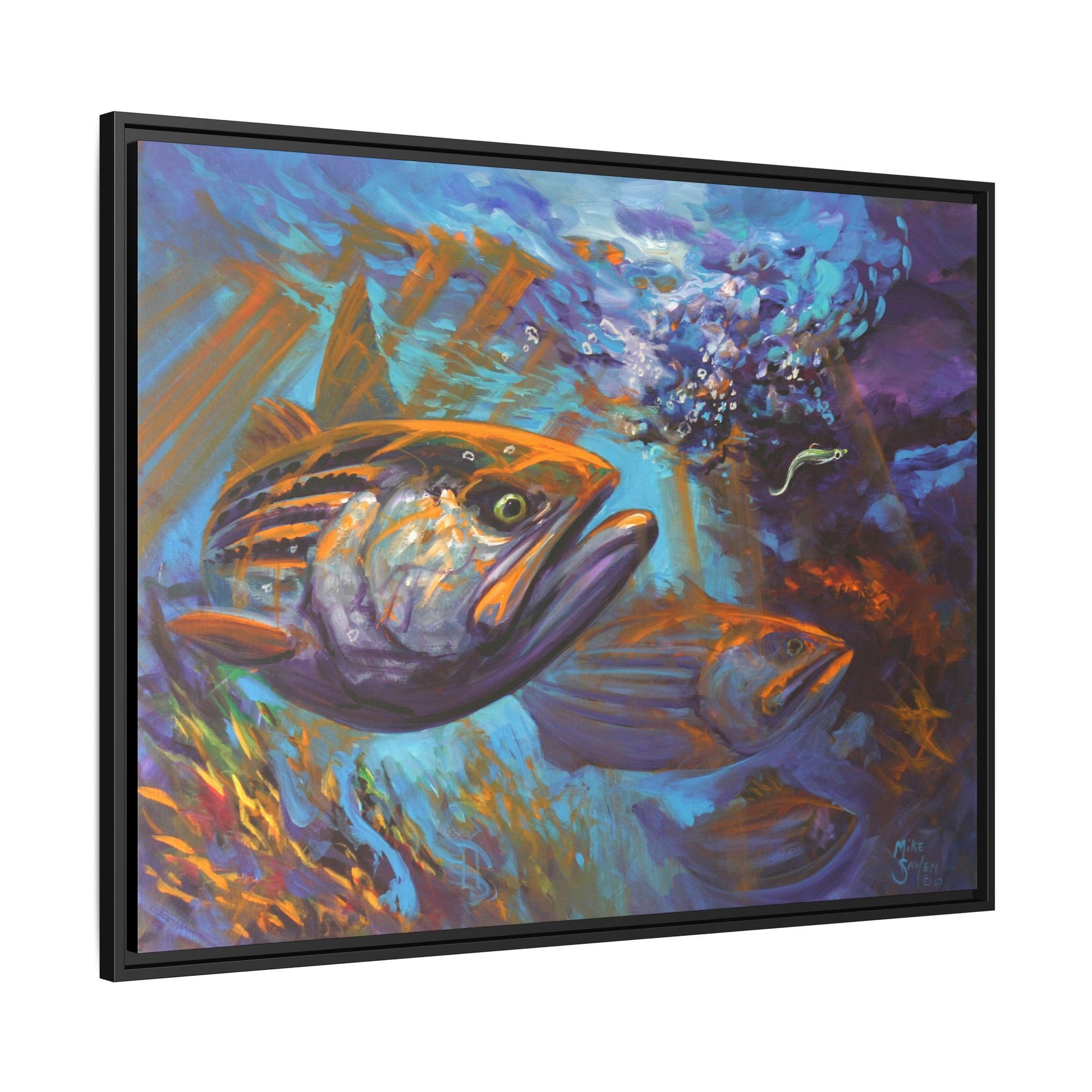 In Aggressive Intentions, Mike Savlen captures striped bass in full pursuit — energy charging through the water as bait flashes and currents swirl in dramatic color. This contemporary coastal piece brings the rush of the hunt to life with bold brushwork, glowing contrast, and vivid expression.