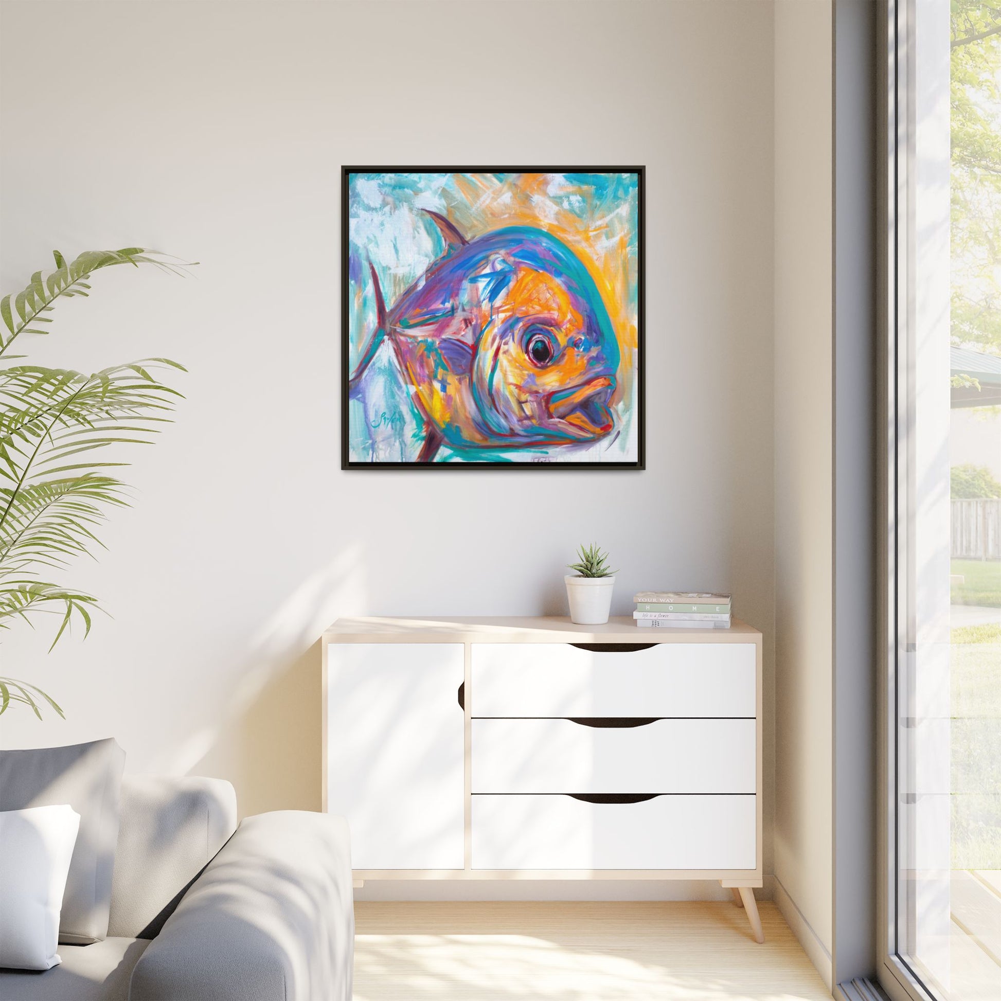 Bold, bright, and built to stand out. Expressionist Permit by Mike Savlen turns this iconic gamefish into a burst of electric color — layered strokes of violet, tangerine, aqua and coral that bring instant energy to any space. Printed on matte canvas and framed for a clean, finished presentation, it’s ideal for beach houses, modern homes, offices, or anyone who lives for saltwater and sea-life aesthetics. A killer gift for birthdays, housewarmings, or any ocean-obsessed friend.