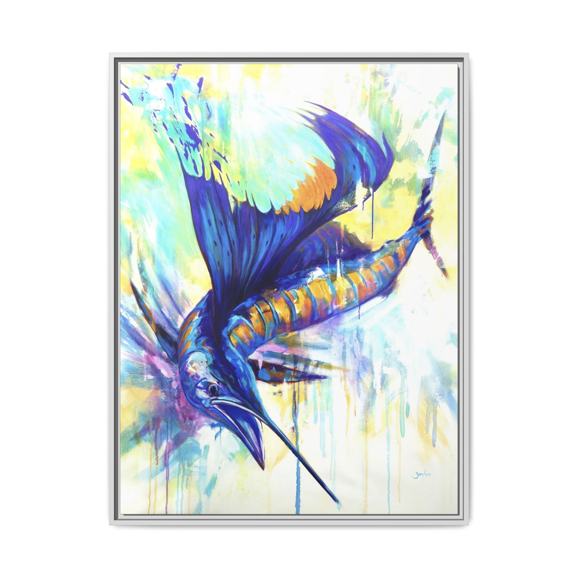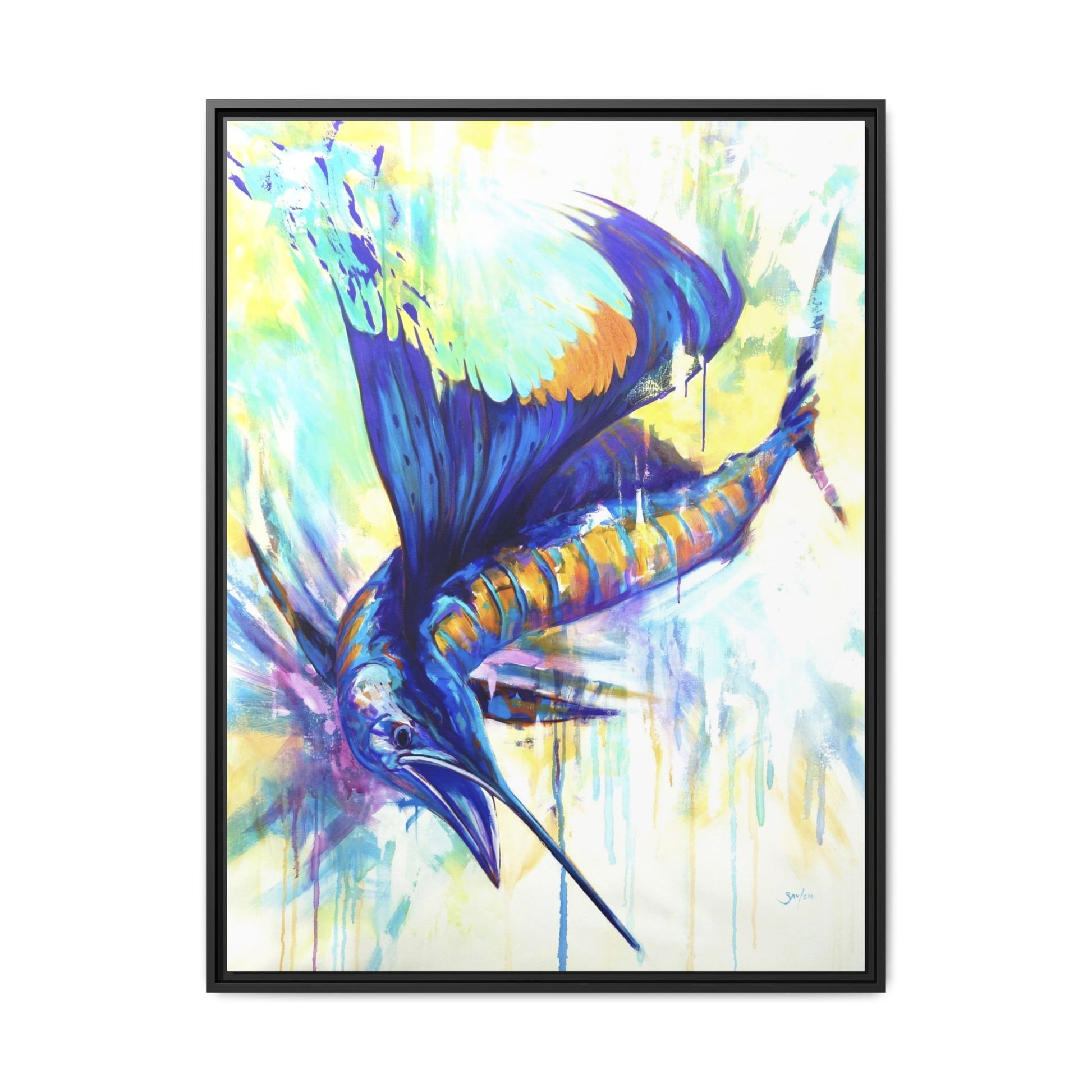 Vibrant, untamed, and alive with motion — Pelagic Dragon captures the fierce beauty of the open ocean’s fastest predator. In this expressionist masterpiece, Mike Savlen paints the sailfish as both warrior and dancer — its luminous blues and golds exploding across the canvas like sunlight on waves.