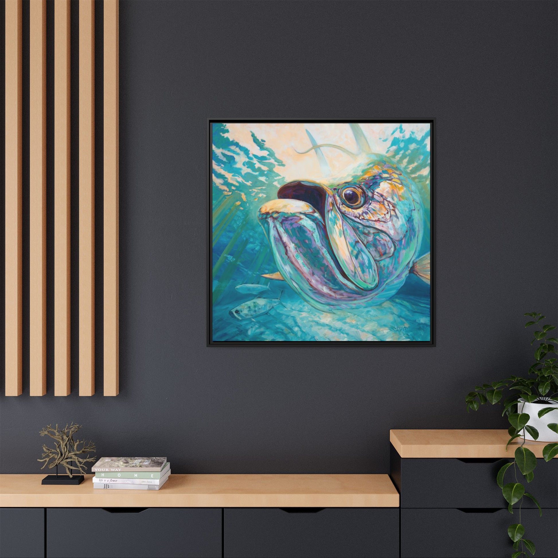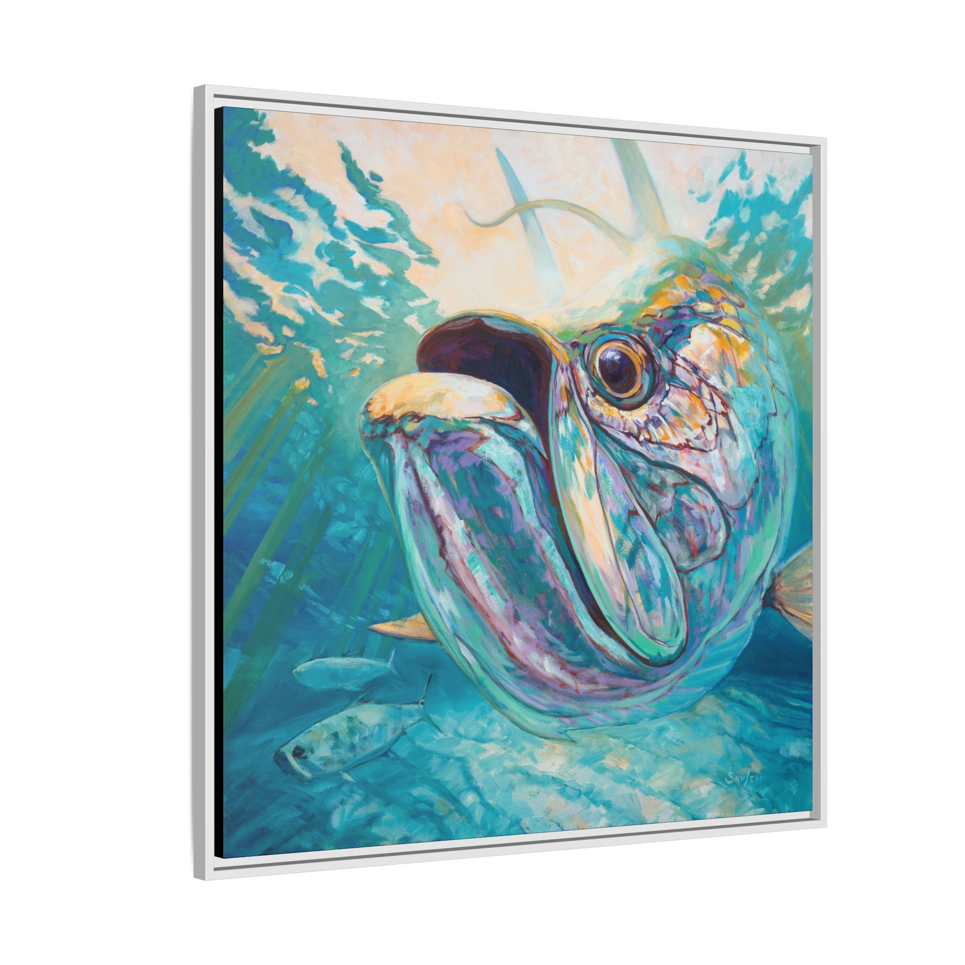 Colorful Tarpon Art Print by Savlen on a matte canvas framed in multiple colors. This vibrant and unique print is perfect for those looking to add a pop of color to their home decor. Ideal for art lovers, fish enthusiasts, and anyone looking to brighten up their space. Great for decorating a beach house or as a gift for a fishing enthusiast.